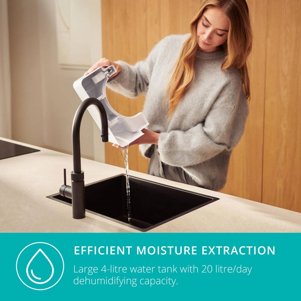 In 24 hours, Bora extracts up to 20 litres of moisture from the air. Its water tank has a capacity of 4 litres, or you can connect a hose for continuous drainage. The built-in carbon filter extracts gases, smoke, and odours from your home, to ensure clean air. Bora uses an ecologically kind R290-refrigerant and has a self-cleaning mode so it can be put away safe and dry.