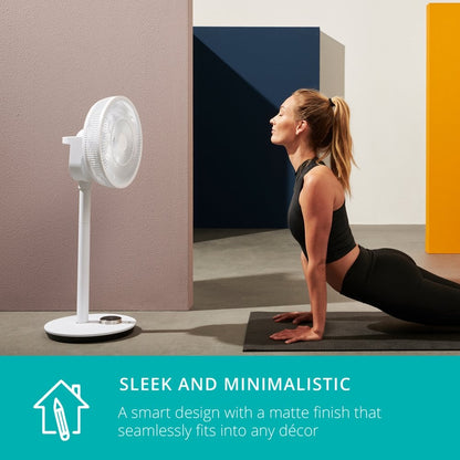 A minimalistic design with a matte finish that fits seamlessly into any décor. Adjustable height, allowing you to effortlessly transition from pedestal (88cm) to tabletop (51cm), by simply removing the extension. The convenient magnetic remote control can be stored on the back of the fan.